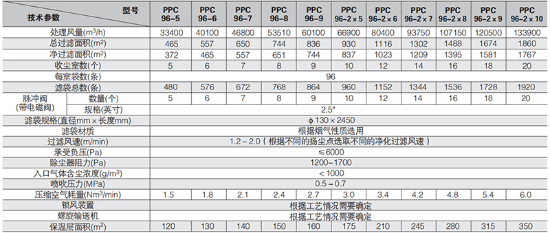 3、表中的处理风量是毛过滤风速为1.2m/min时计算得出的,仅供用户尘源点的含尘浓度小于200g/m³(标)和净过滤风速也不详的情况下,直接按表中所标的处理风量进行选型之用。