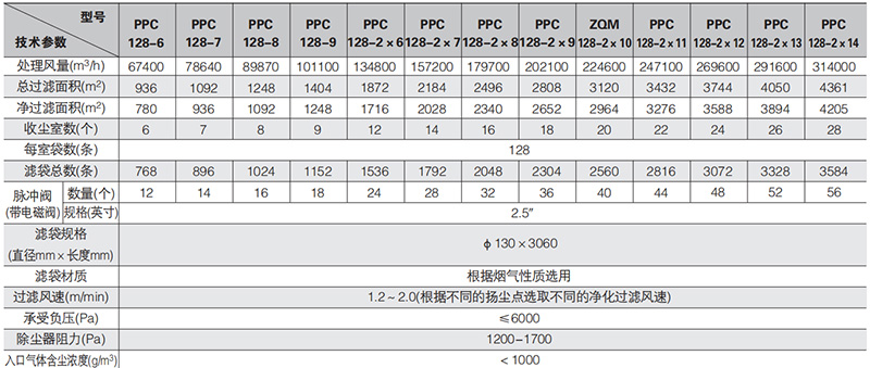 PPC-N×128型气箱式脉冲袋式除尘器技术性能表