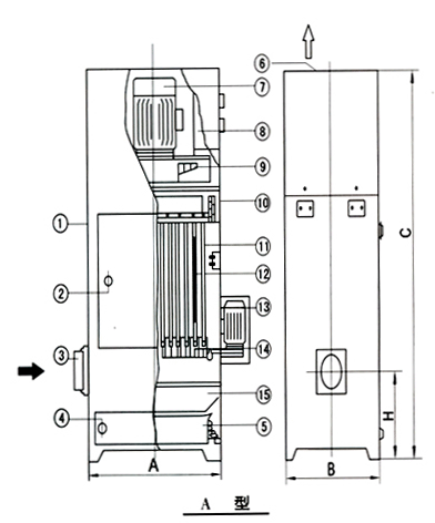 含尘气体进入箱体,由扁布袋过滤器进行过滤,粉尘被阻留在滤袋外表面,已净化的气体通过滤袋进入风机,由风机吸入直接排入室内(也可接管排至室外)。